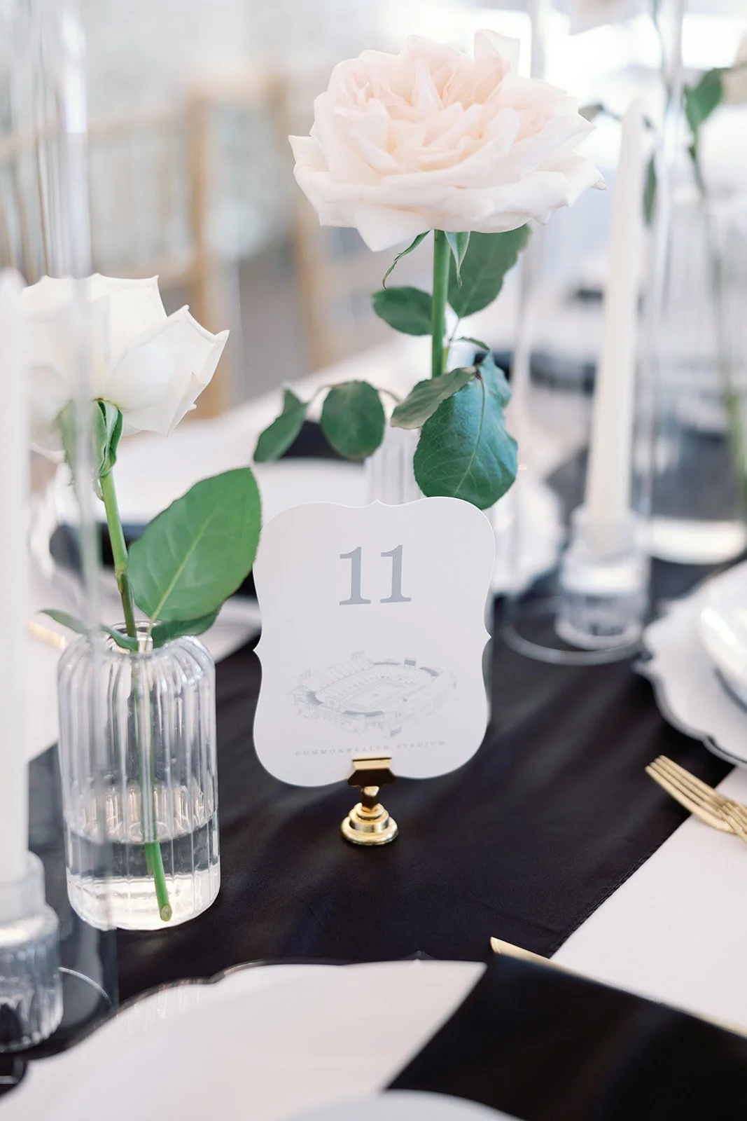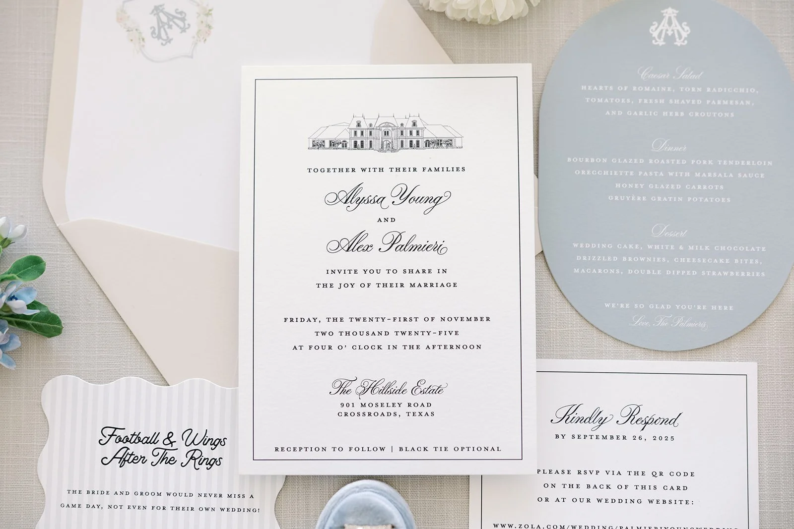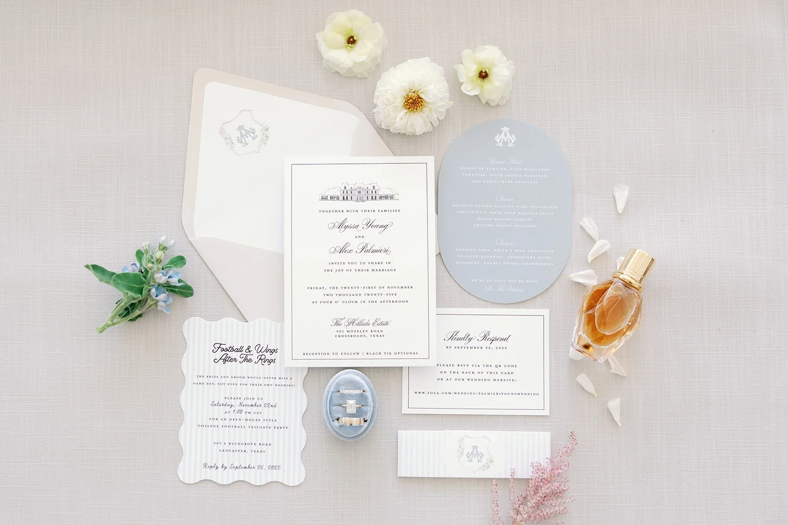 To complete the day, we designed vow books, a fabric welcome banner, bar signage, table numbers, menus, and head table place cards, along with additional reception details. The celebration continued into the weekend with a Saturday tailgate, planned so their wedding would never compete with football season, a fitting detail for these two.