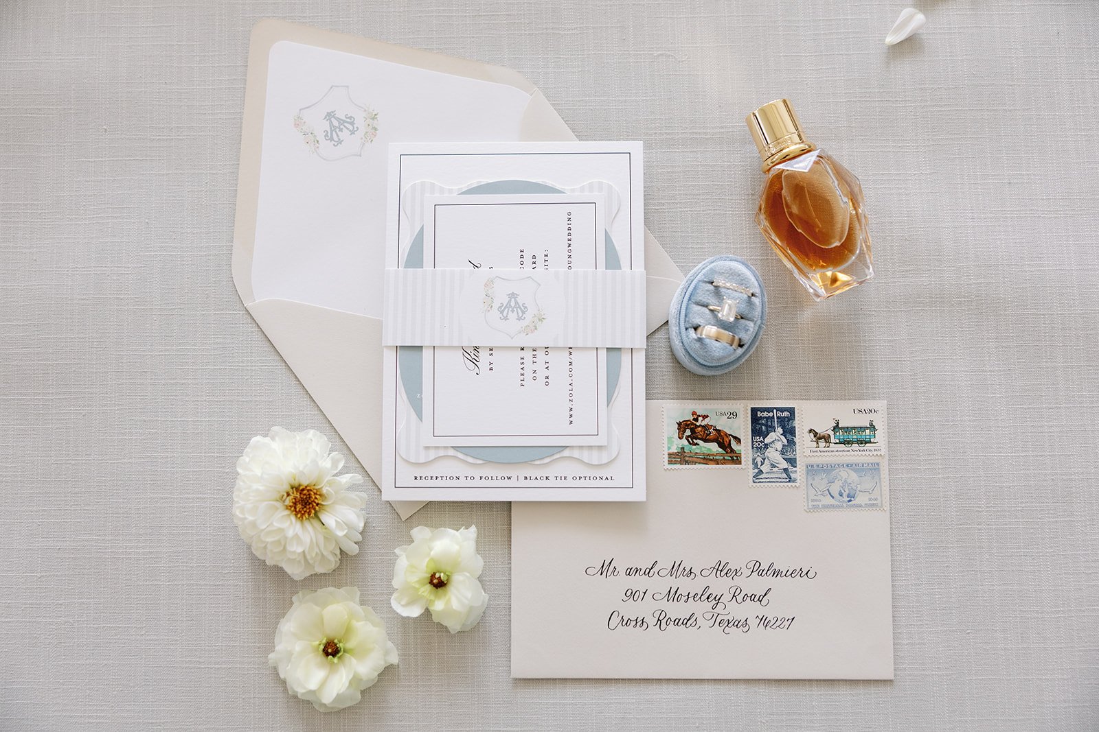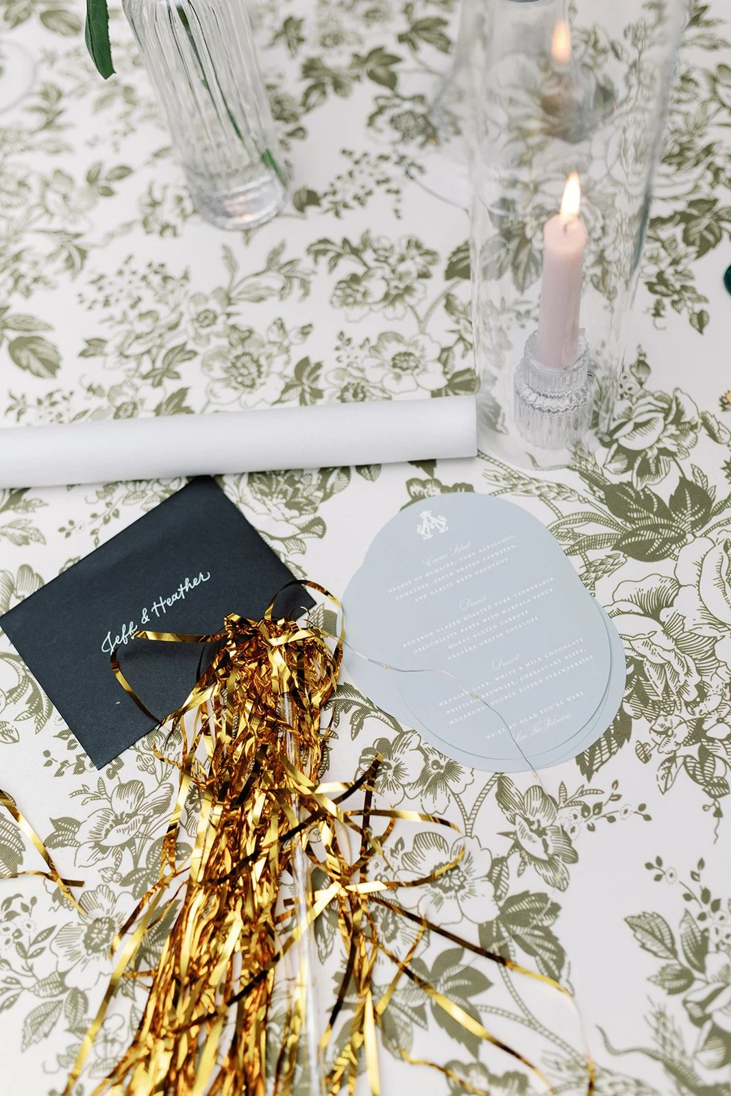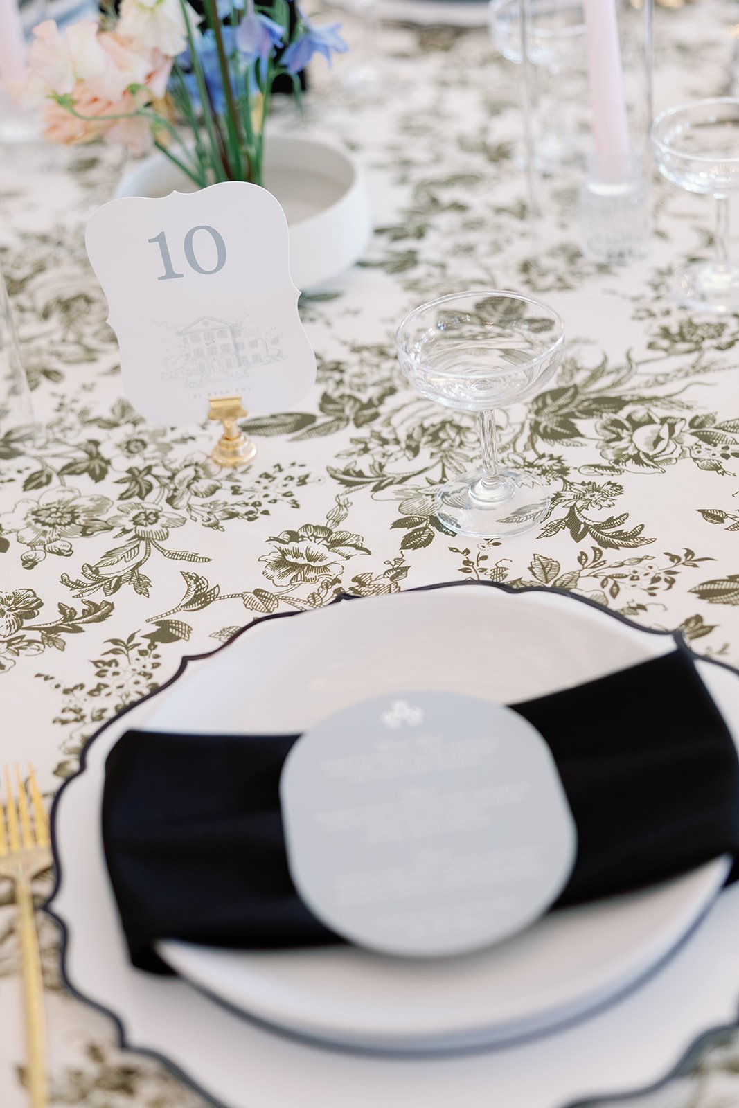 To complete the day, we designed vow books, a fabric welcome banner, bar signage, table numbers, menus, and head table place cards, along with additional reception details. The celebration continued into the weekend with a Saturday tailgate, planned so their wedding would never compete with football season, a fitting detail for these two.